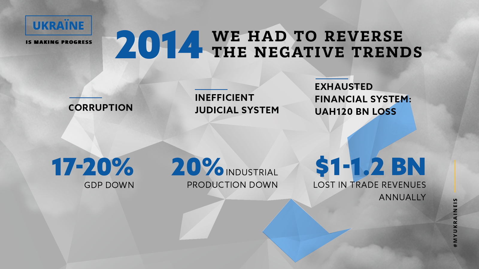 In 2014 Ukrainian nation has been faced with the negative trends: corruption, inefficient judicial system, exhausted financial system and dysfunctional army. Since the Revolution of Dignity Ukrainian people decided to achieve changes inside the country.